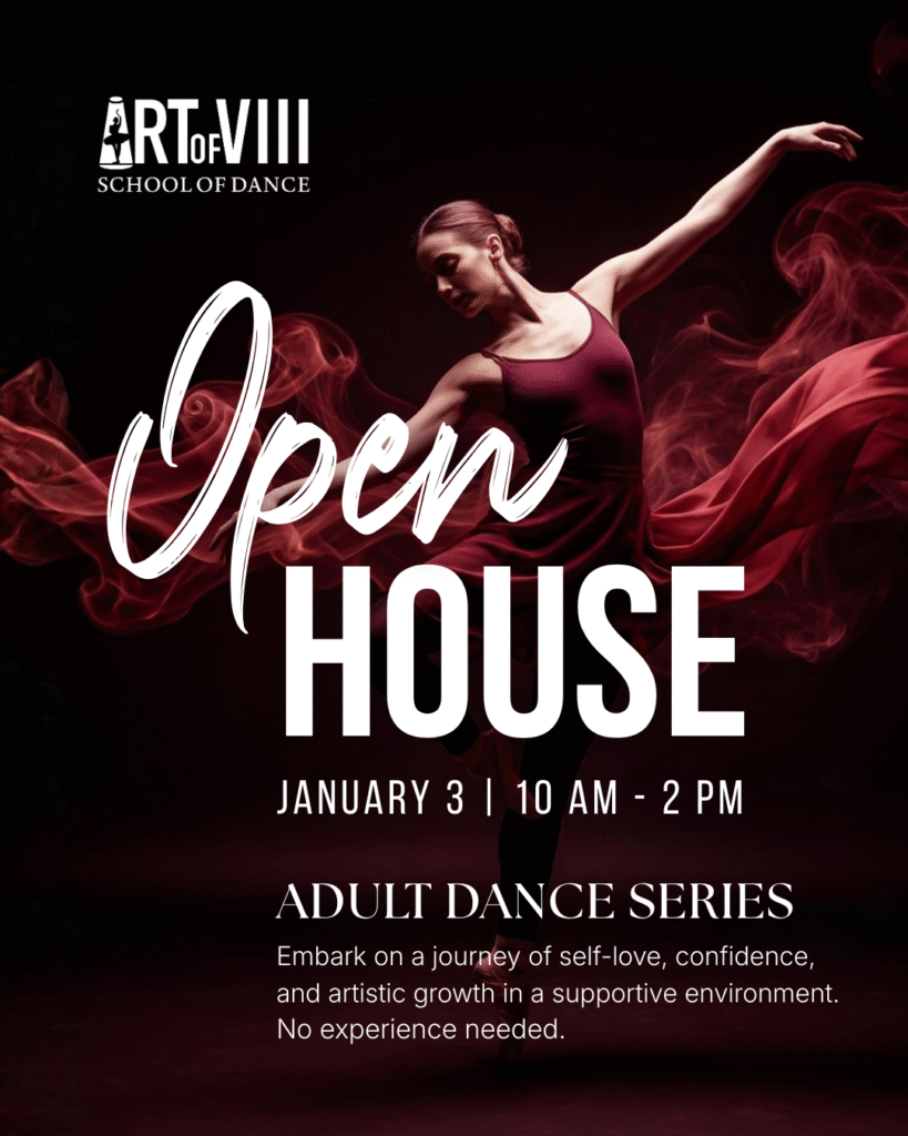 Step into the sanctuary of self-discovery at Art of VIII School of Dance, where adults of all experience levels are invited to awaken their bodies and spirits through the transformative power of dance. Our Open House showcases our CORE dance curriculum (Ballet, Modern, Jazz, and Contemporary) the fundamental styles that build strong, versatile dancers and nourish the soul.